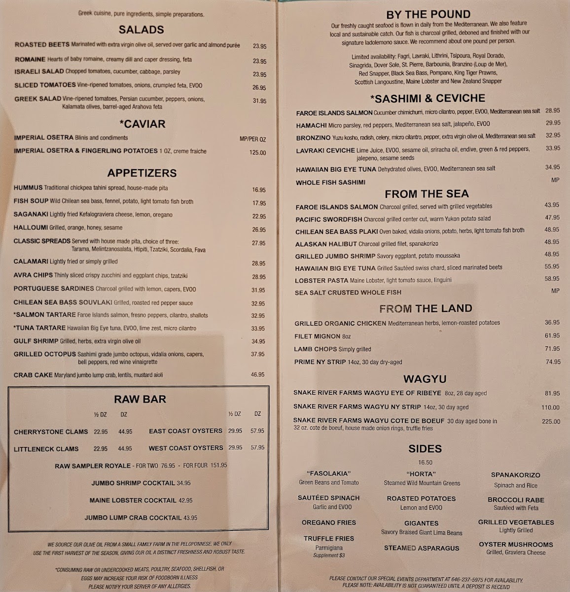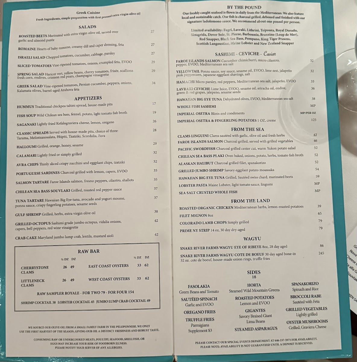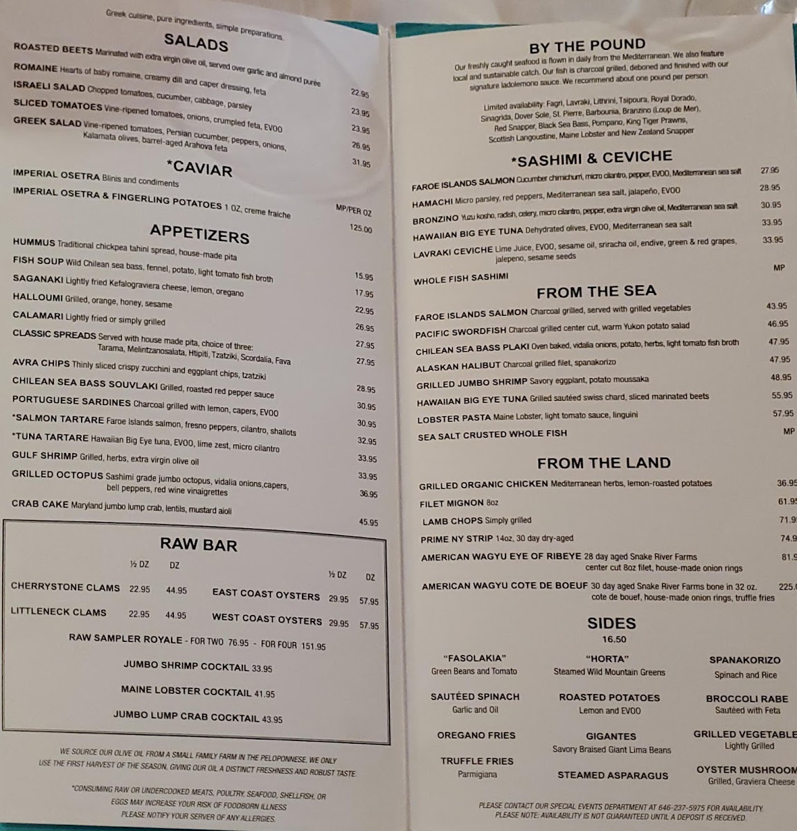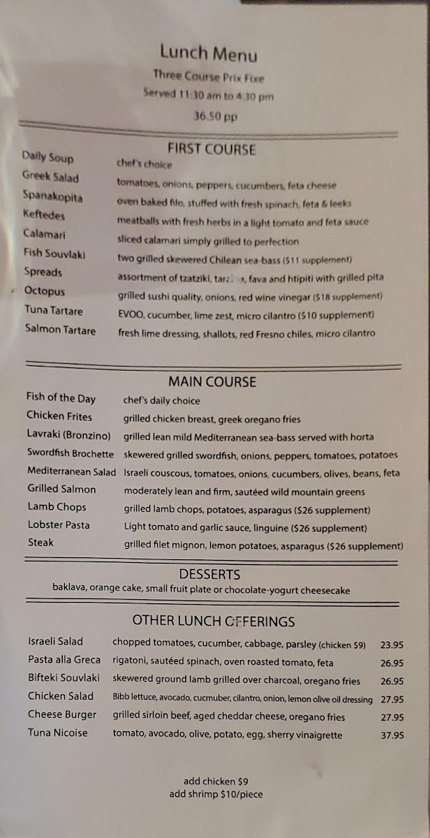 The menu features a diverse selection of Greek and Mediterranean cuisine, including appetizers, salads, seafood, whole fish, and desserts. It is structured to offer a range of dining options suitable for casual meals and more elaborate dining experiences.