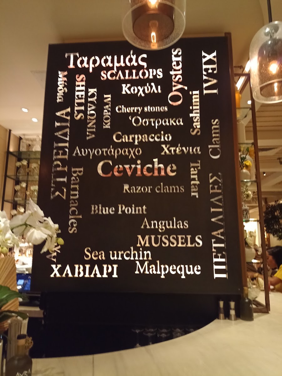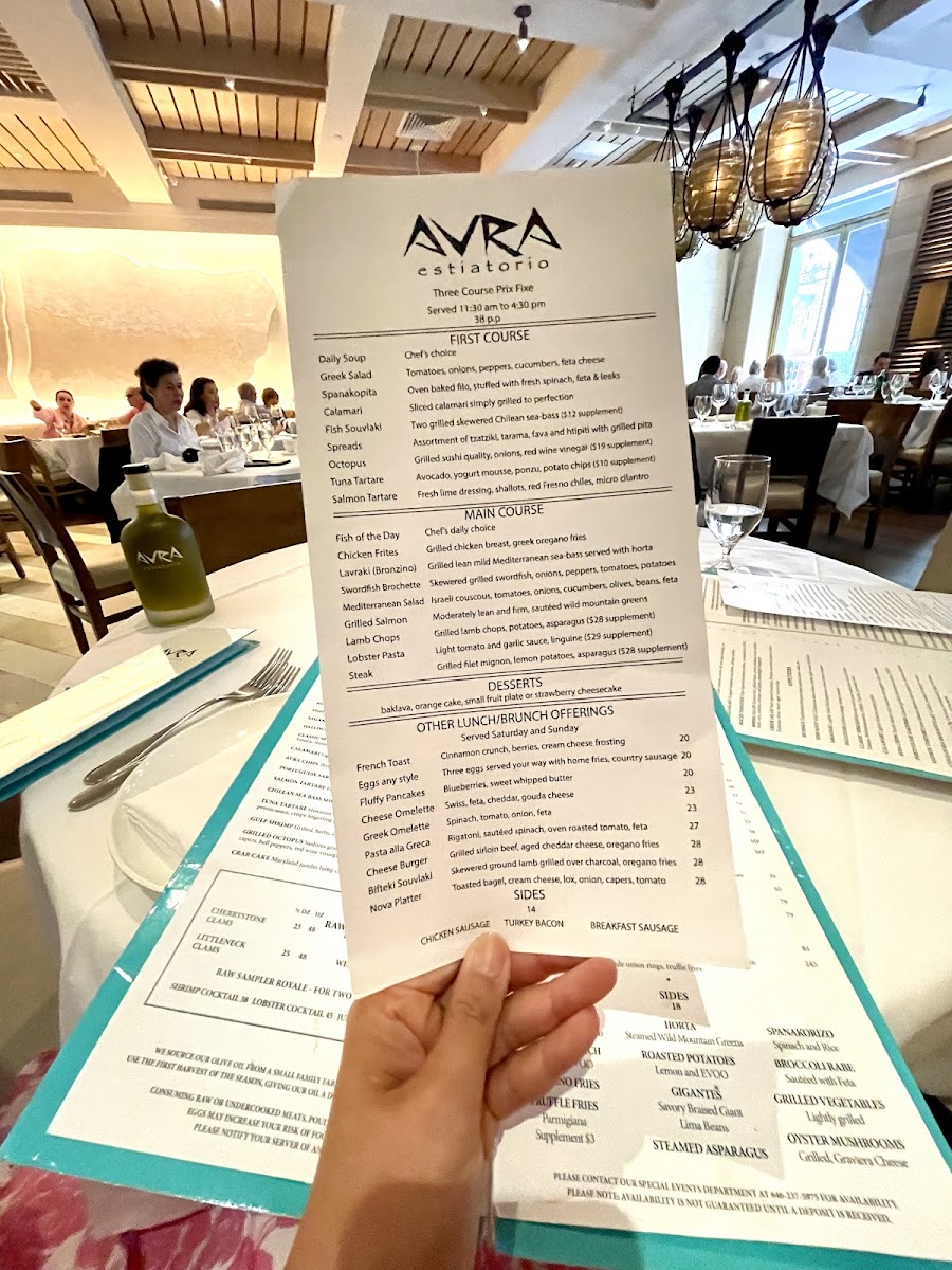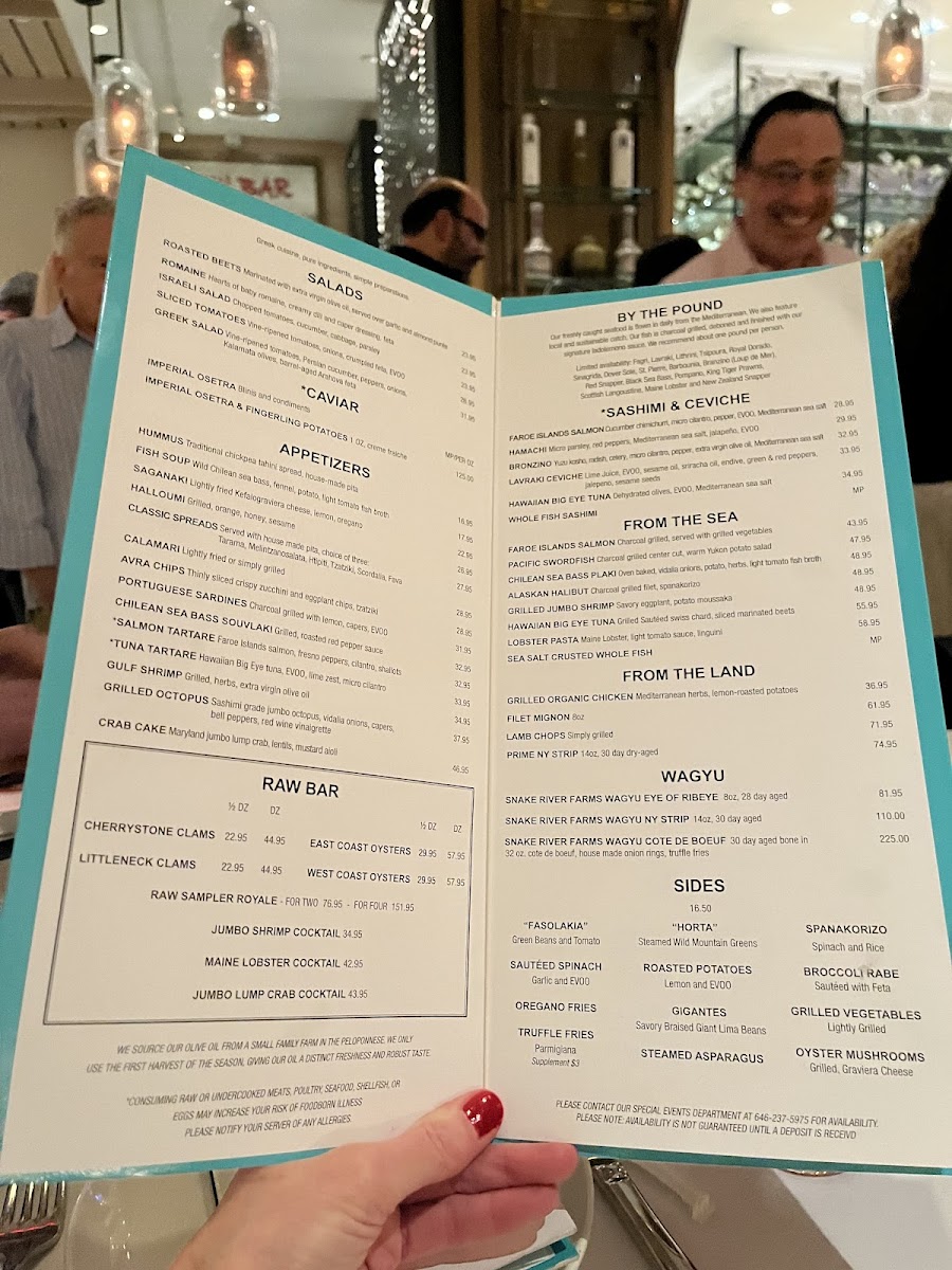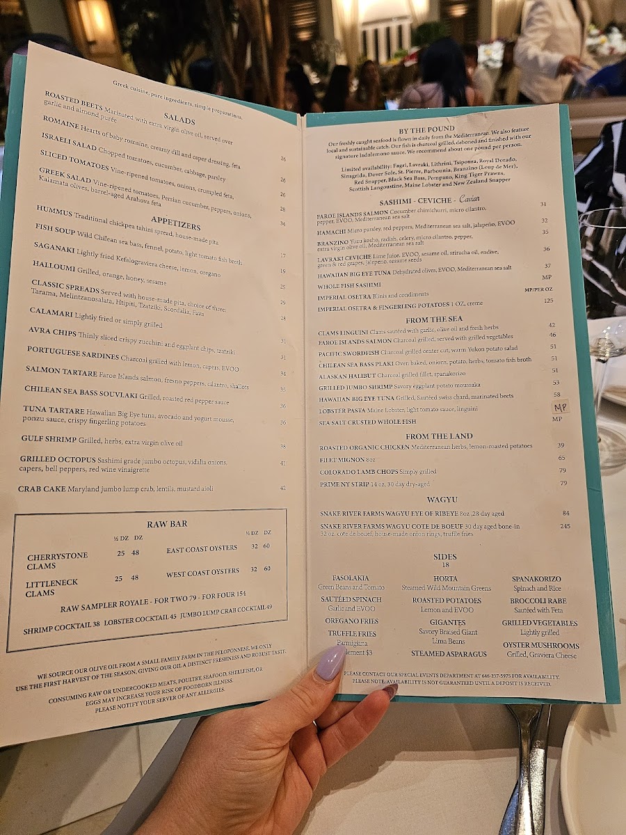 The menu features a diverse selection of Greek and Mediterranean cuisine, including appetizers, salads, seafood, whole fish, and desserts. It is structured to offer a range of dining options suitable for casual meals and more elaborate dining experiences.