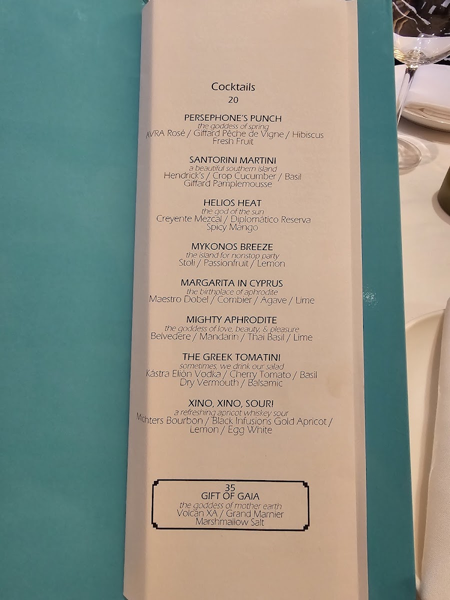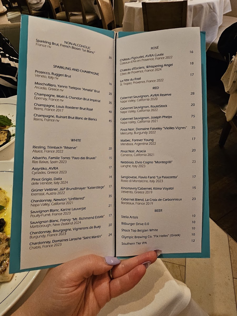 Desserts: The dessert menu includes traditional and contemporary items such as baklava, chocolate yogurt cheesecake, olive oil cake, and other regional sweets.
